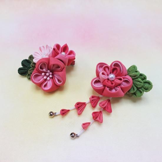 紅花で染め上げた塩瀬羽二重を使って、ひとつひとつ丁寧に手作りしたつまみ細工の髪飾り。コサージュピン仕上げなので取り付けも簡単。ショートヘアのお子様でもお使いいただけます。