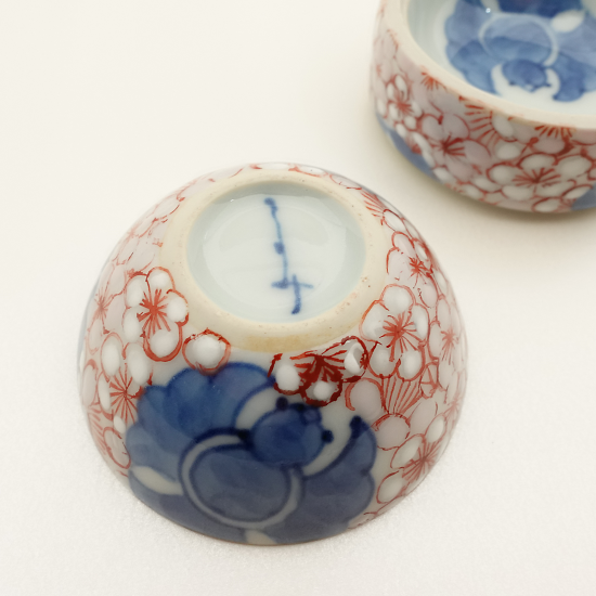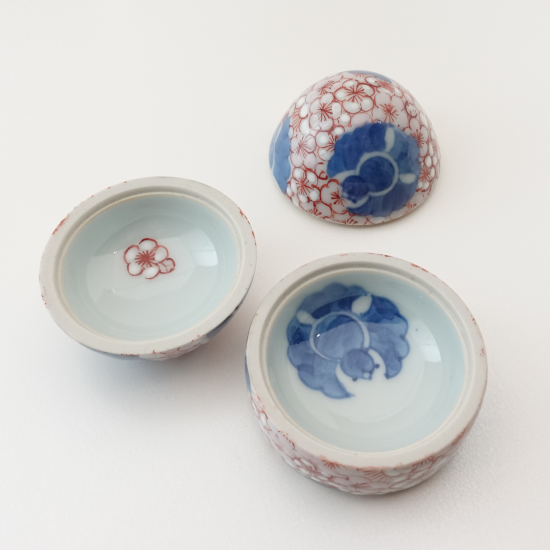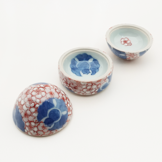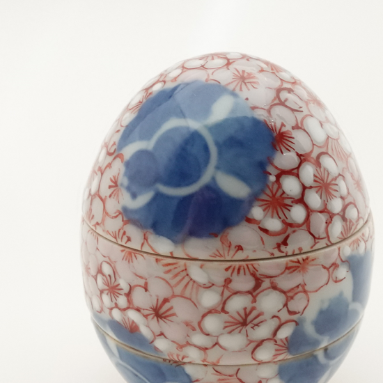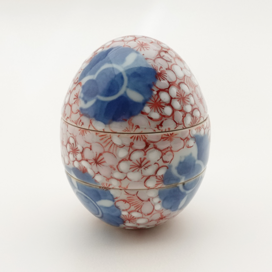 かわいらしい卵型の三段重に、たなか氏ならではの独特のタッチで描かれた、紅白に色付く梅花と、福を招いてくれそうな染付のふくら雀。江戸時代の有田焼によくみられる「染錦」という、染付と赤絵を組み合わせる手法で描かれた、贅沢な紅器です。