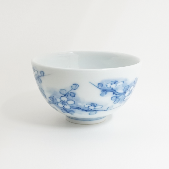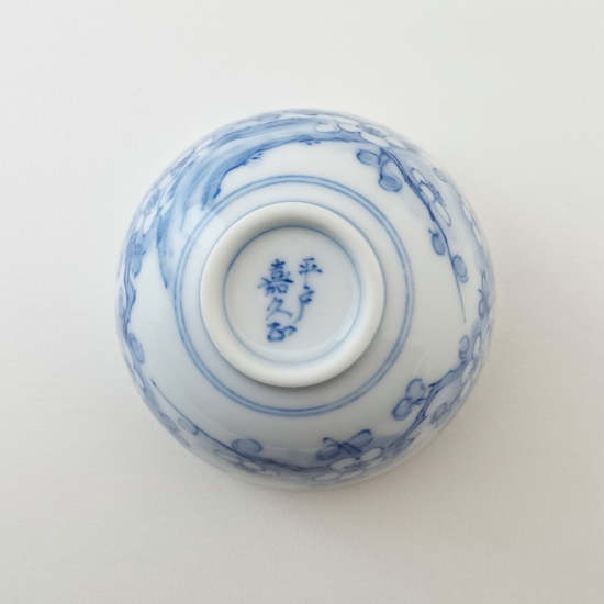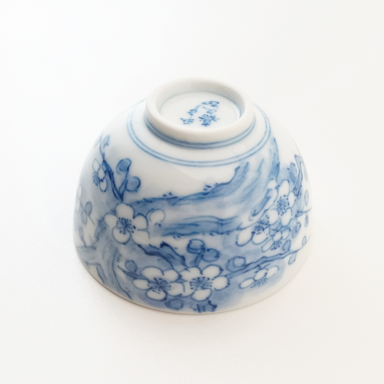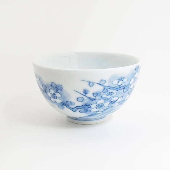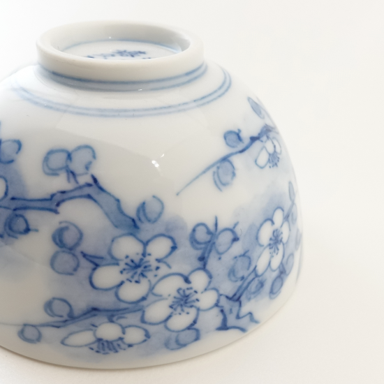 400年の歴史と持つみかわち焼、平戸嘉久正窯の技を受け継ぐ里見氏に、小町紅のために制作いただいた器です。みかわち焼ならではの透き通るような美しい白地に、精緻な筆遣いで描かれた染付の白梅が浮かび上がります。