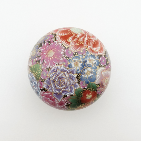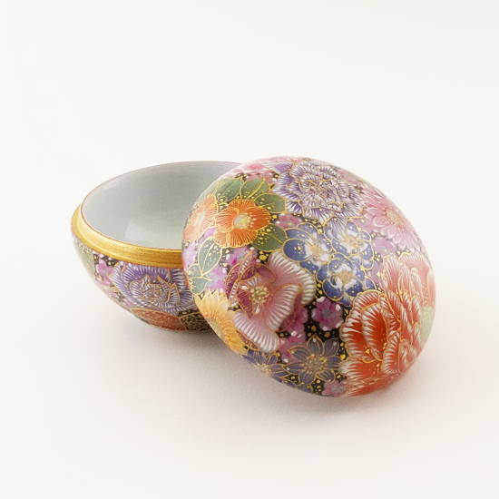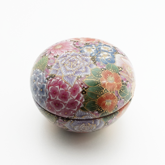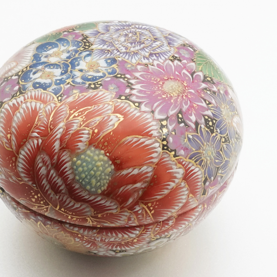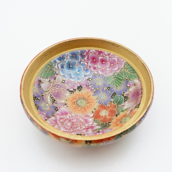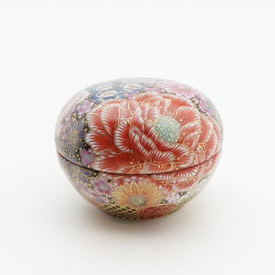 九谷焼の伝統技法「花詰」で描かれた一点物の紅器。僅かな隙間もなく、丁寧に描き込まれた幾種類もの花たちが煌びやかに咲き誇ります。色彩の異なる絵具を幾重にも塗り重ね、何度も焼成することで生み出された立体感のある花ひとつひとつからは、エネルギーを感じます。