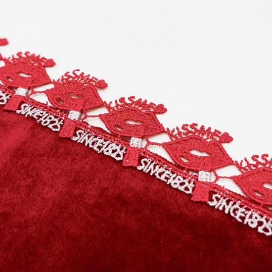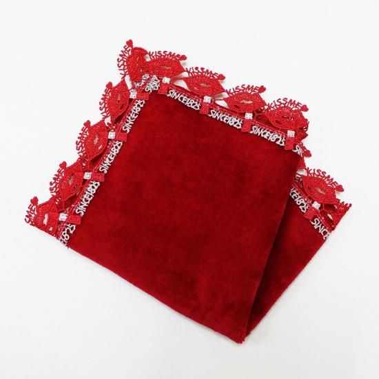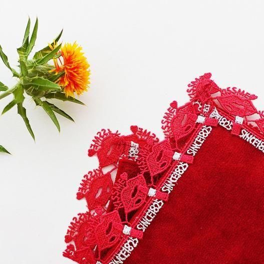 200年の歴史を感じさせる、品よく落ち着いた赤色を基調にしたタオルハンカチに、口紅を塗る唇を表現したレースをあしらいました。