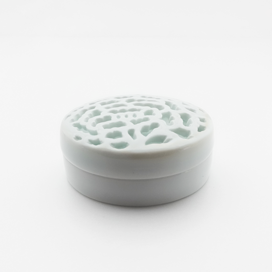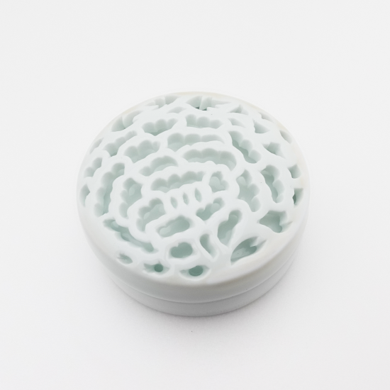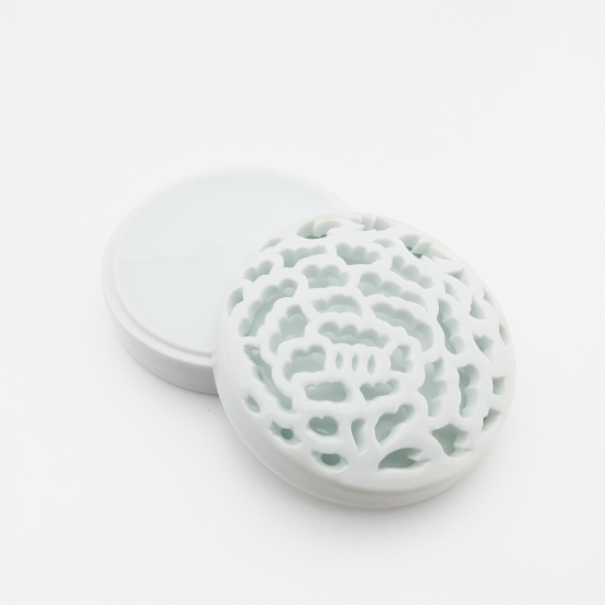 400年の伝統を受け継ぐ、玉泉窯の代表的な技法である「白磁透し彫り」で作られた特別な紅器。彫刻刀で丁寧に彫り抜いていく、繊細で精巧な手仕事がよって生み出された広がりを見せる牡丹の花。みかわち焼の透き通るような白磁に、優美な世界が広がります。